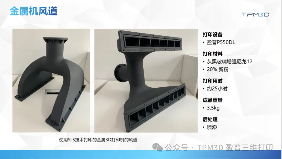 而盈普 SLS 大尺寸設(shè)備成功攻克這一難題。某金屬機生產(chǎn)商借助盈普 P550DL 大尺寸雙激光設(shè)備,順利實現(xiàn)重達 3.5kg、內(nèi)部結(jié)構(gòu)復雜的風道一體化成型打印。在雙激光器的高效運作下,整個打印過程僅耗時約 25 小時,極大簡化生產(chǎn)工序,顯著提升生產(chǎn)效率。
