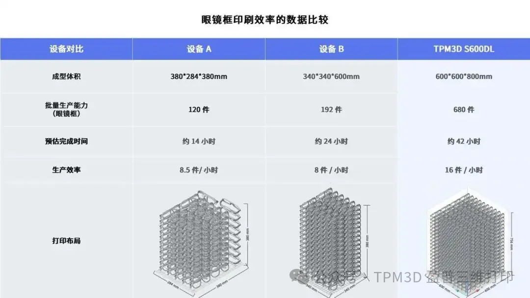 TPM3D 批量生產(chǎn),產(chǎn)量倍增 盈普大尺寸設(shè)備不僅擅長打印大尺寸零件,在中小零件批量生產(chǎn)方面同樣表現(xiàn)出色,通過優(yōu)化單次打印零件排布,大幅提高打印效率。據(jù)國外專業(yè)行業(yè)媒體3D Natives報道,S600DL一次可打印約680個眼鏡框(打印高度 800 毫米),平均每小時可打印16件,較其他尺寸打印機每小時8 到 8.5 件的效率實現(xiàn)翻倍。