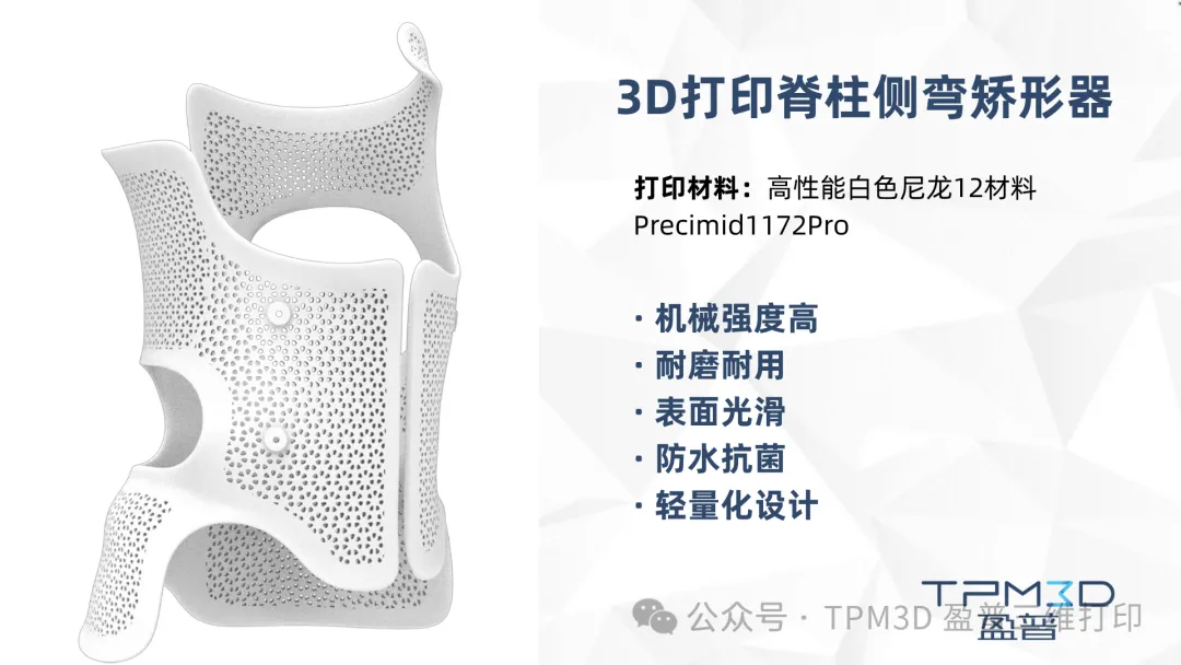 2022年,工信部發布首批“增材制造典型應用場景名單”,盈普三維“脊柱側彎矯正器批量定制生產”應用成功入選,成為全國首批進入該名單的3D打印裝備制造商和服務提供商之一。