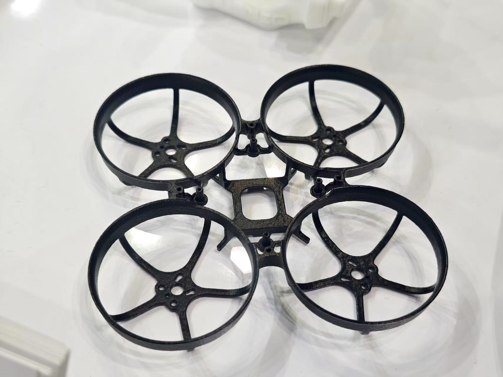 在現(xiàn)場展示的眾多應(yīng)用案例中,盈普三維的解決方案展現(xiàn)出卓越性能與廣泛適用性。 微型無人機機架采用尼龍 11 材料 Precimid1180 BLK 打印而成,成品尺寸為 100x100x14.8mm, 兼具輕量化與高強度的特性,為無人機的高效飛行與靈活操控提供有力保障。