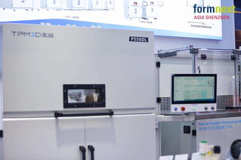 展會現場,盈普的核心展品——大尺寸雙激光SLS打印設備P550DL及一站式粉末處理工作站PPS成為了專業觀眾關注的焦點。